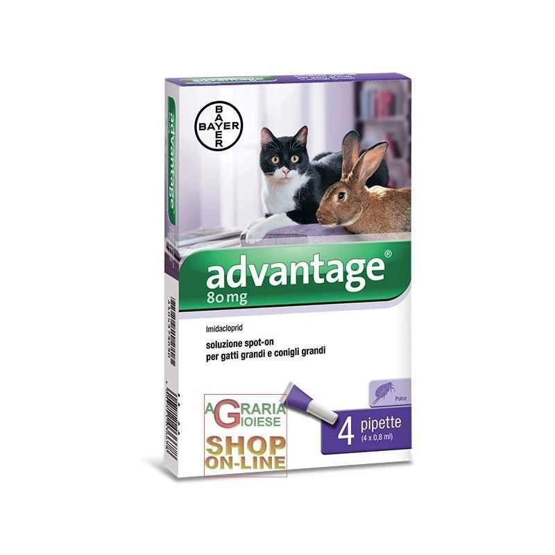 - dvantage 80 gatti e conigli grandi, antiparassitario spot on contro le pulci, Advantage 80 è il nuovo antipulci esterno Bayer per gatti. Antipulci per gatti del peso di 4 kg o superiore. Advantage elimina e previene le infestazioni da pulci per 3-4 settimane con un unico trattamento, da ripetersi eventualmente in funzione della presenza di pulci nell’ambiente.