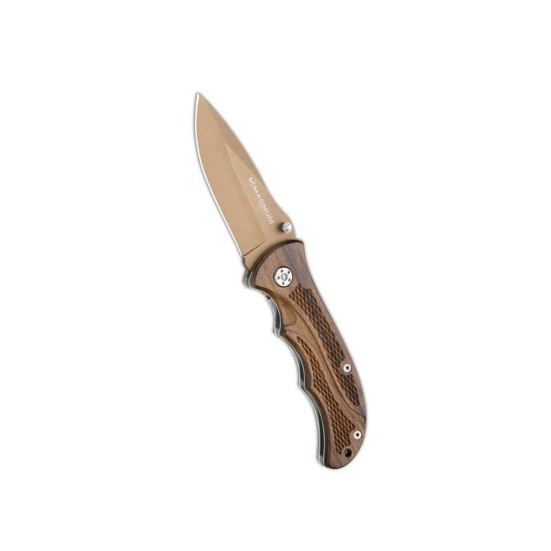 Coltello chiudibile con rivestimento marrone della lama in acciaio 440 e guance in legno, anche la clip è marrone.
