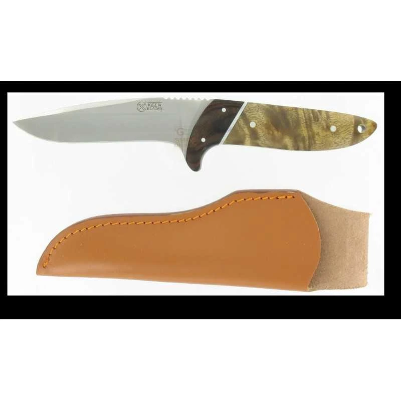 - Coltello a lama fissa satinata interamente passante. Manico in legno sdoppiato. Fodero in cuoio.