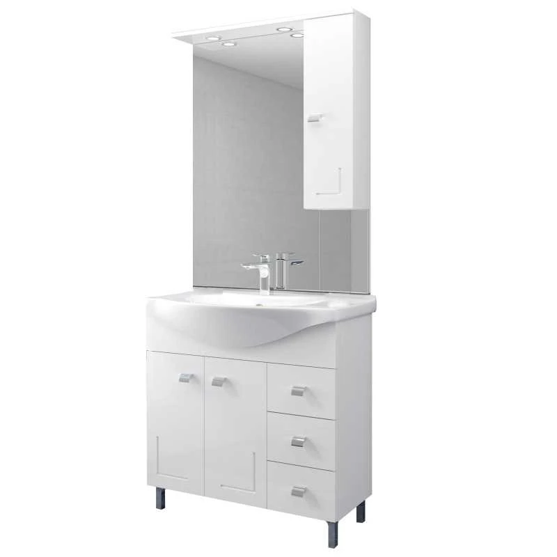 Mobile 85 cm struttura in truciolare, frontale in MDF laccato bianco. due ante e tre cassetti. Completo di specchio con pensile, illuminazione LED e lavabo integrale (rubinetto escluso). Dimensioni cm 86x50x194h