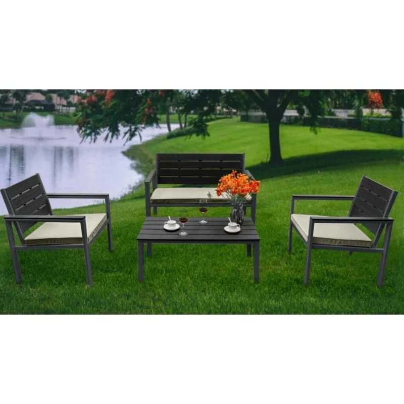 Struttura in metallo, seduta e schienale in HDPE effetto legno, completo di cuscini.